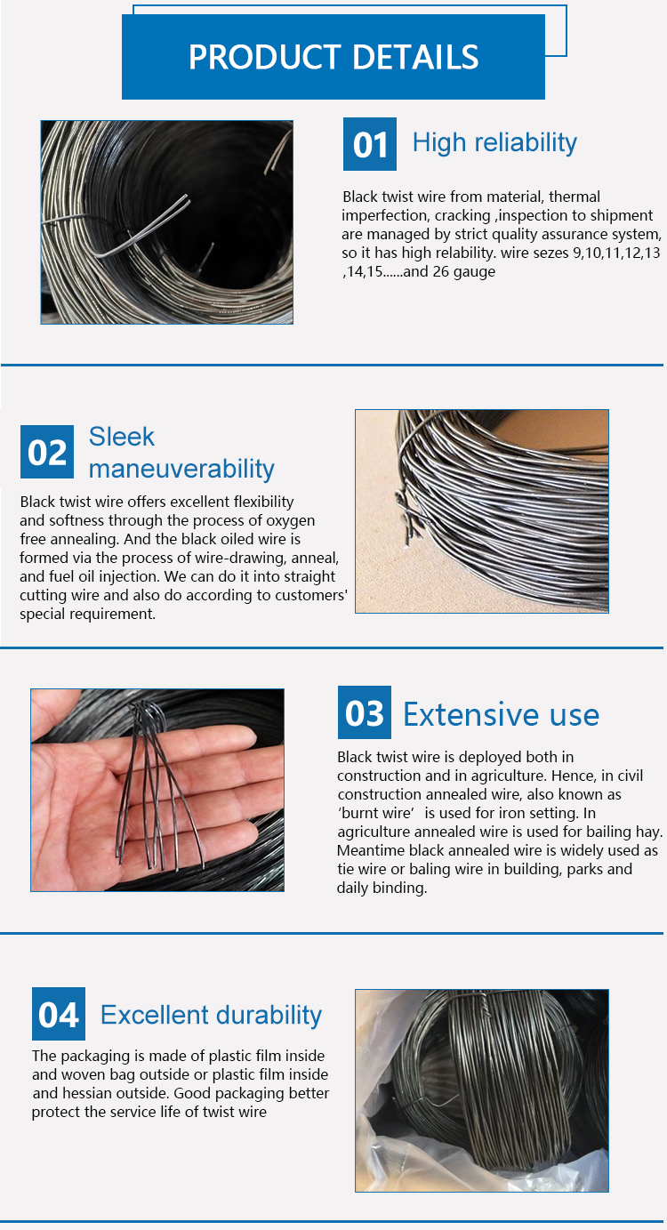ESPECIFICAÇÃO Nome do produto Fio de torção preto Diâmetro do fio BWG8-BWG24, tamanho popular: BWG16 e BWG18 Linhas de torção 2 linhas, linhas 3, 4 linhas, linhas 5, 6 linhas, linhas de 7, 9 linhas ou custom made Embalagem 1kg/rolo, 10kgs ou 20kgs